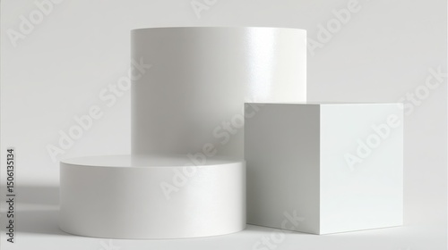 Three white geometric shapes, two cylinders and a cube, on a plain background