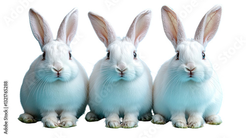 Three White Rabbits: A captivating studio shot showcases three pristine, fluffy white rabbits posing side by side, their upright ears adding a touch of curiosity to their endearing expressions.