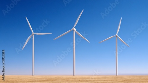Three white wind turbines stand in a dry, tan field under a clear blue sky. The image is simple and clean, with a focus on the turbines' forms and