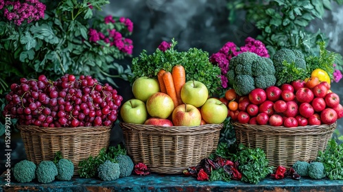 Three wicker baskets overflowing with colorful fruits and vegetables