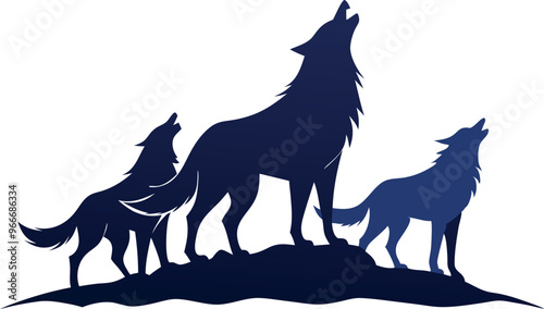 Three wolves standing on a hill, one of them howling. Concept of wildness and freedom, as the wolves are free to roam and express themselves through their howling