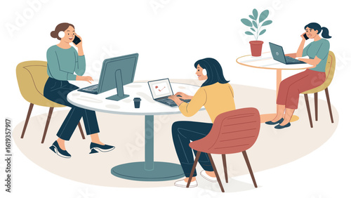 Three women working together in a modern office, perfect for illustrating teamwork and collaboration for your website or brochure.