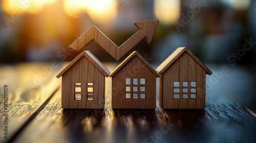 Three wooden house models on a wooden surface with a wooden upward arrow symbolizing growth and investment in real estate during warm sunlight