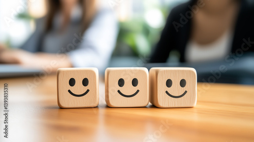 Three wooden smiling face blocks aligned on a wooden desk with blurred coworkers in background representing positive customer service and satisfaction in workplace.