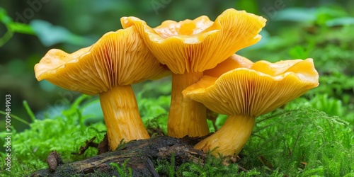 Three yellow mushrooms are growing on a mossy log. The mushrooms are small and appear to be in the middle of the log