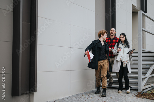 Three young business professionals walking and discussing work-related ideas outside a modern office building.