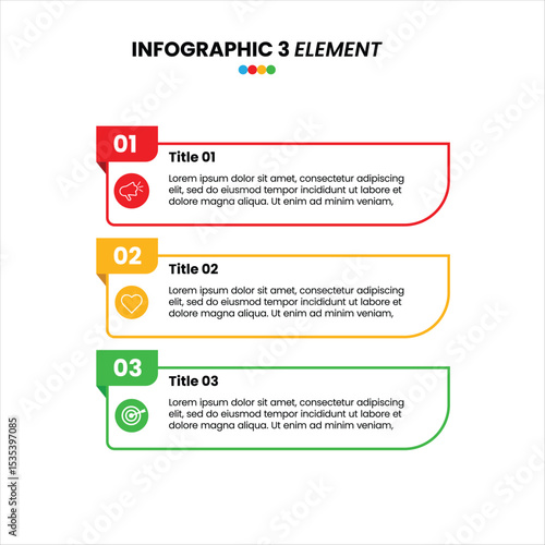 Three-step infographic template with icons and color-coded elements: hand (idea), heart (engagement), and target (goal). Includes placeholder titles and text.