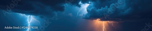 Thunderstorm with massive black clouds and bright yellow lightning, electric blue, elemental force