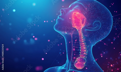 Thyroid gland, hologram on a blue background with medical indicators. Ultrasound diagnostics, thyroid diseases