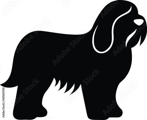 Tibetan Terrier dog silhouette standing with long hair and beard vector graphic for pet breed design