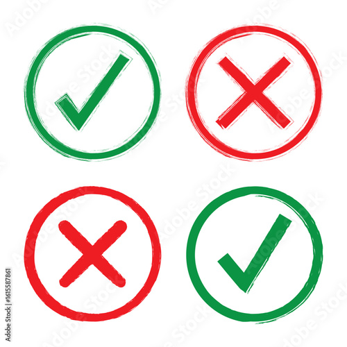 Tick and cross brush signs. Green checkmark OK and red X icons, isolated on white background. Symbols YES and NO button for vote, decision, web.