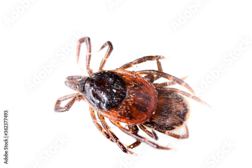 Ticks or Tics (Ixodida), also called hard or scale ticks, vector of pathogens that can cause lethal human and animal disease. Nasty parasites picked from dog after a walk in forest. Estonia, Europe.