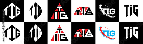 TIG letter logo design in six style. TIG polygon, circle, triangle, hexagon, flat and simple style with black and white color variation letter logo set in one artboard. TIG minimalist and classic logo