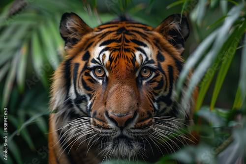 Tiger gazing directly forward, close up, green leaves of plants in jungle surround. Intense, confident gaze of mighty predator. Beauty of endangered animal species. Preserving wildlife conservation