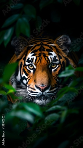 Tiger peering through jungle foliage at night; wildlife wallpaper