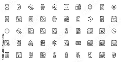 Time and Date icon set. Vector illustration. Minimalist icons pack. Includes symbols for calendar, clock, alarm, timer, schedule, reminder, holiday, stopwatch and more. Editable stroke.