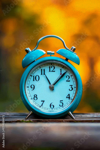 Time Flies by: A vintage blue alarm clock sits on a wooden table, framed by a vibrant autumnal backdrop, a reminder of the fleeting nature of time and the importance of seizing the moment.