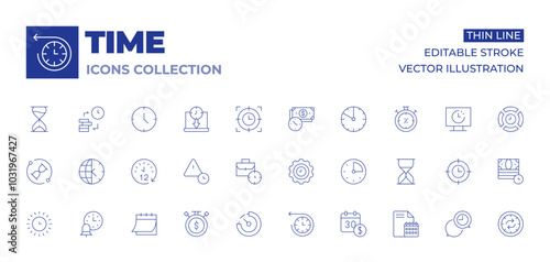 Time icons collection. Thin Line icons, editable stroke. job, process, remain, sun, hours, minutes, calendar, expired, sale time, time, time management, time zone