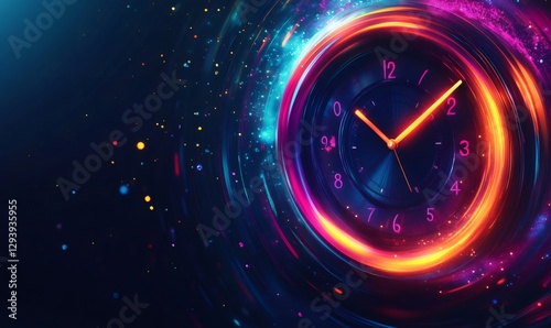 Time is quickly passing by on this modern clock face surrounded by colorful abstract swirls and light particles