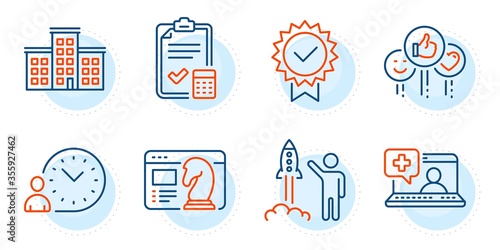 Time management, Like and Accounting checklist signs. Company, Launch project and Seo strategy line icons set. Certificate, Medical help symbols. Building, Business innovation. Vector