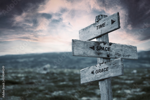 time space grace text quote caption on wooden signpost outdoors in nature. Stock sign words theme.