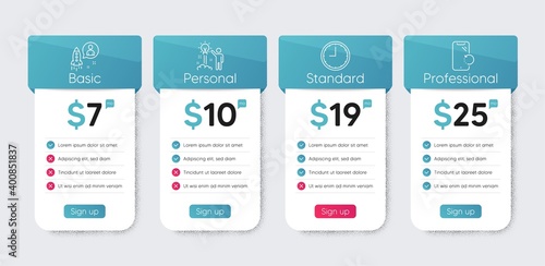 Time, Startup and Creative idea line icons set. Price table chart, business plan template. Smartphone recovery sign. Office clock, Developer, Startup. Phone repair. Technology set. Vector