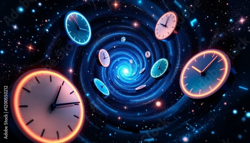 Time Warp, Clocks in a swirling galaxy. Concept of time travel, relativity, and the cosmos.