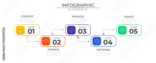 Timeline connect five steps infographic elements plan concept design vector with icons. Business workflow network project template for presentation and report.