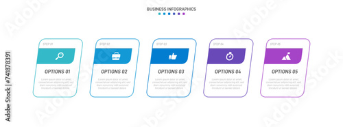 Timeline infographic with infochart. Modern presentation template with 5 spets for business process. Website template on white background for concept modern design. Horizontal layout.