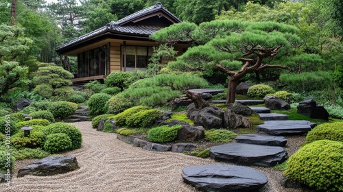 Tiny botanical park with sculpted trees, stone pathways, and a Japanese-style home in the background.