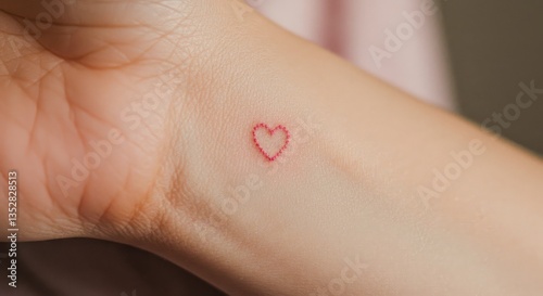 Tiny Heart Tattoo on Delicate Wrist - A close-up of a small, delicate heart tattoo on a wrist. Symbolizing love, intimacy, tenderness, commitment, and self-expression