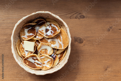 Tiny pancake cereal quarantined trending food. Fun pastry at home for breakfast with sauce and butter on a plate. Grilled homemade food on a wooden table background. Mini Top view place for text