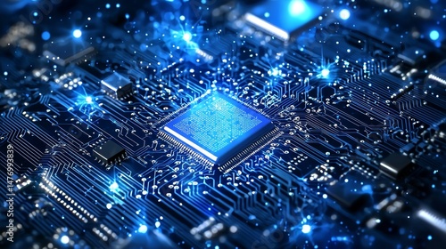 Tiny silicon chips intricately arranged with detailed circuitry.