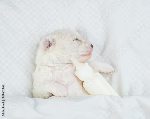 Tiny white Lapdog puppy sleeps on a bed at home and hugs bottle of milk. Top down view
