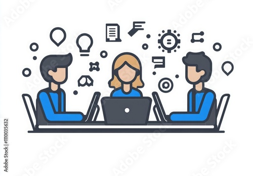 "Tiny Workers and Icons Showcasing Teamwork Around a Computer"