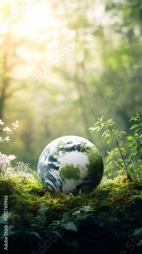 Tiny world perched on verdant moss, reflecting global conservation efforts amid lush forest sunlight