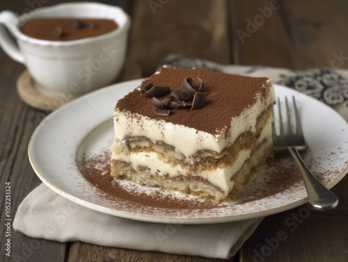 Tiramisu Сake with Coffee cup on wooden table, selective focus