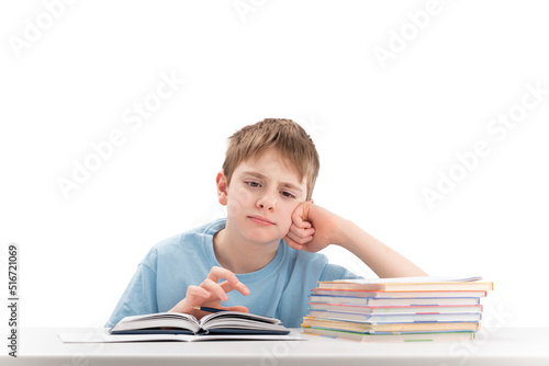 Tired boy doing homework at table and attentively reads book. Portrait of schoolboy at desk with stack of notebooks. White background.