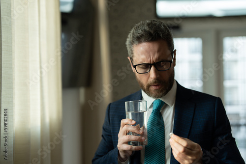 Tired man suffering from headache after computer work, exhausted with closed eyes touching head, relieving pain, migraine. Man taking a Medicine pill from headache migraine.