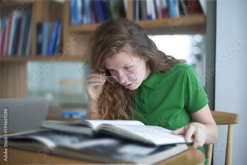 tired overworked girl, exhausted young woman in glasses college or university student is study hard in library, lesson, problem with eyes, myopic purblind. Vision eyes problems, myopia, blindness.