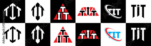 TIT letter logo design in six style. TIT polygon, circle, triangle, hexagon, flat and simple style with black and white color variation letter logo set in one artboard. TIT minimalist and classic logo