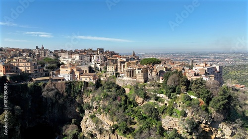 Vista aerea del borgo di Tivoli che affaccia sulla valle dove scorre il fiume Aniene.