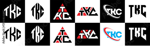 TKC letter logo design in six style. TKC polygon, circle, triangle, hexagon, flat and simple style with black and white color variation letter logo set in one artboard. TKC minimalist and classic logo