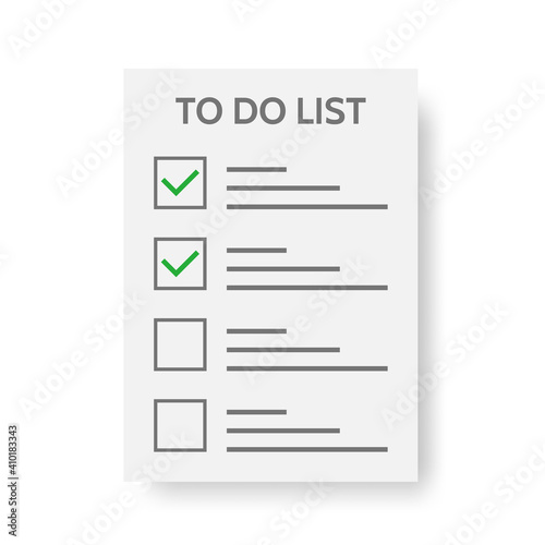 To do list icon on white background. Daily planner. Business schedule or organizer. Paper sheet with green check mark. Paper note. Month planning, time management. Task completed. Vector illustration