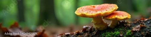 Toadstool clusters with decaying leaves and tree trunks, fungi, forest