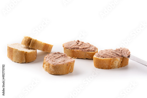 Toasted bread with pork liver pate isolated on white background