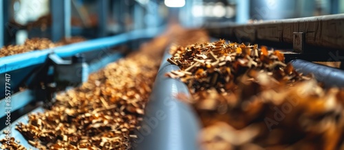 Tobacco is being conveyed on a conveyor belt in a cigarette manufacturing factory. with copy space image. Place for adding text or design