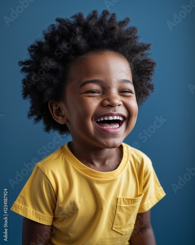 Toddler black African boy laughing short afro yellow t-shirt on blue background