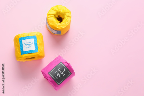 Toilet paper rolls on pink background