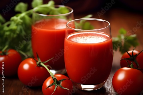 Tomato juice in a glass and fresh tomatoes on a wooden table